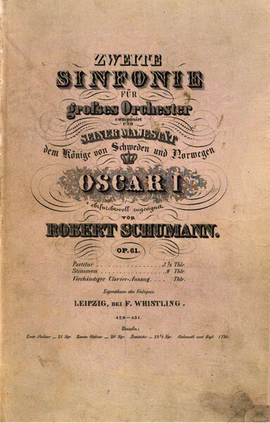 Den andra symfonin tillägnade Schumann unionskungen Oscar I av Sverige-Norge. Kung Oscar var vår allra mest progressiva kung genom tiderna och dessutom mycket musikintresserad. Liksom sonen Gustaf - som bland annat komponerade Studentsången - verkade han som tonsättare. Han hade tidigare fått en uppmuntrande recension av Schumann i den av honom startade Die Neue Zeitschrift für Musik (ges fortfarande ut!). Kungen tackade för dedikationen med en guldmedalj. Det är dock obekant om Schumann - vilket var vanligt - genast omsatte den ädla metallen i reda pengar.